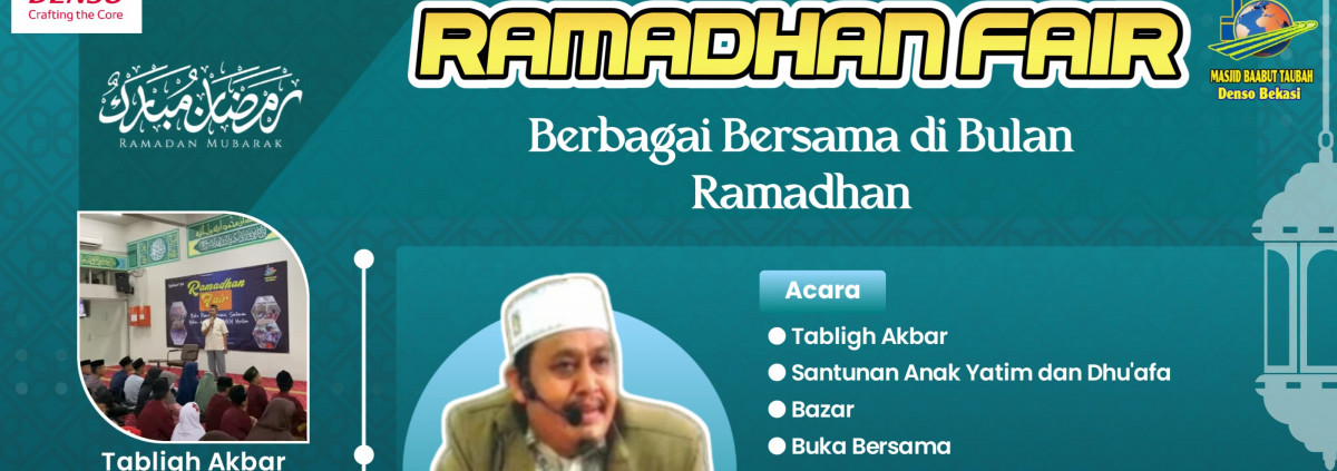 Dalam menyambut Bulan suci Ramadhan 1445H, DKM Baabut Taubah PT. Denso Indonesia menyelenggarakan kegiatan RAMADHAN FAIR yang bertemakan “Berbagi Bersama di Bulan Ramdahan”. Kegiatan ini menghadirkan beberapa acara yang menarik dan penuh manfaat, baik untuk jamaah PT . Denso Indonesia maupun warga di lingkungan perusahaan. Serangkain acara ini berlangsung bersamaan , sehingga antusias seluruh pengunjung sangat besar dan semangat untuk mengadiri acara tersebut.