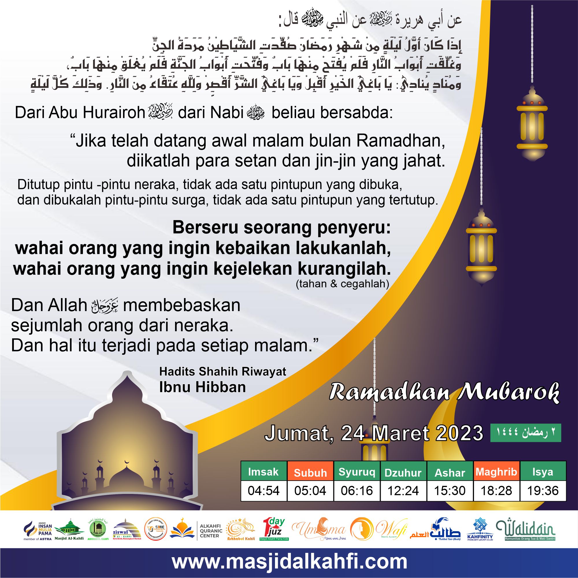 diikatlah para setan dan jin-jin yang jahat. Ditutup pintu -pintu neraka, tidak ada satu pintupun yang dibuka, dan dibukalah pintu-pintu surga, tidak ada satu pintupun yang tertutup.Berseru seorang penyeru: wahai orang yang ingin kebaikan lakukanlah, wahai orang yang ingin kejelekan kurangilah. Dan Allah Suhana Wata'la membebaskan sejumlah orang dari neraka. Dan hal itu terjadi pada setiap malam.” HR. Ibnu Hibban