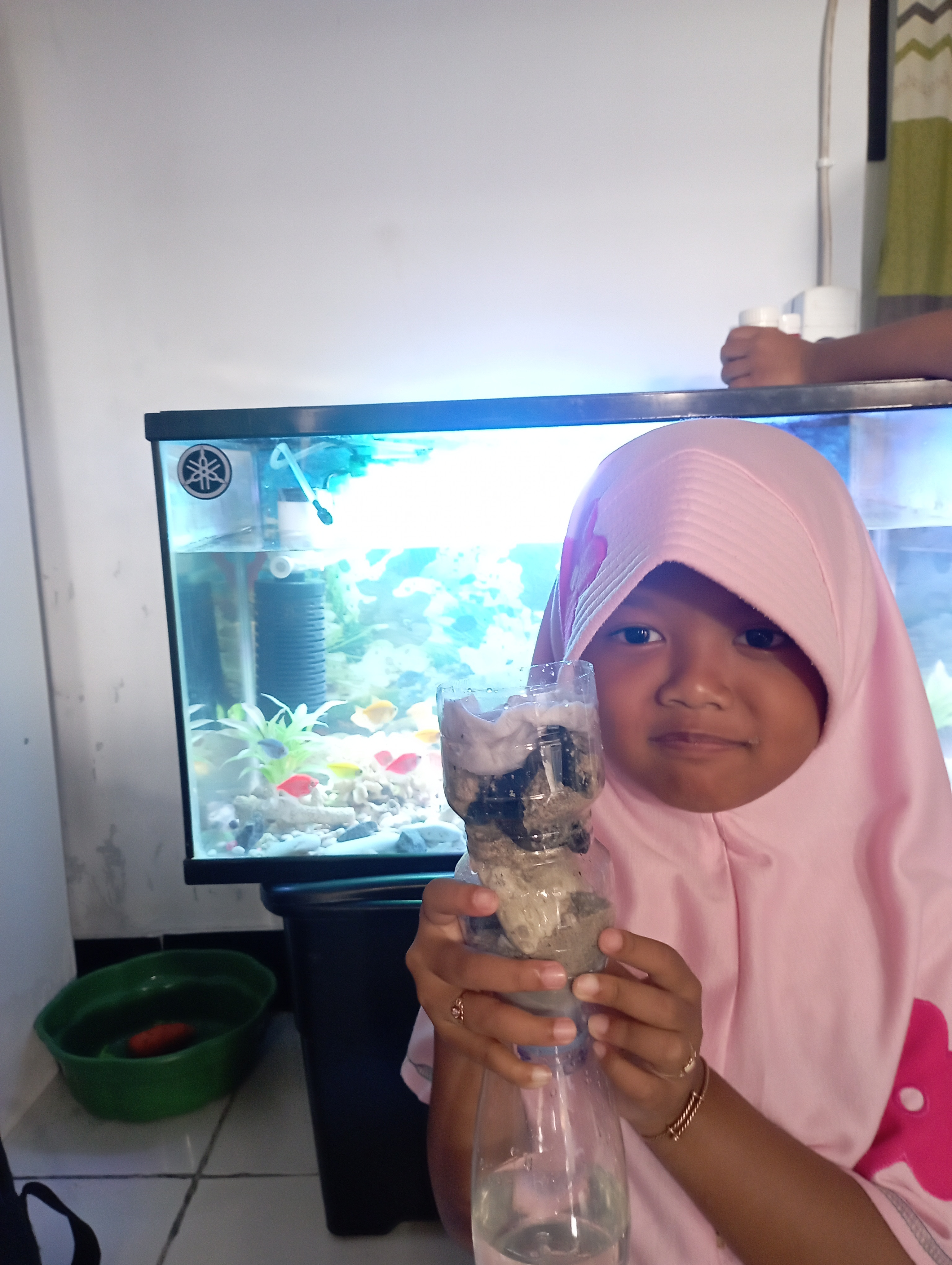 Kegiatan w2 pesantren Ramadhan salah satunya ialah membuat penyaringan air kotor menjadi air bersih.
