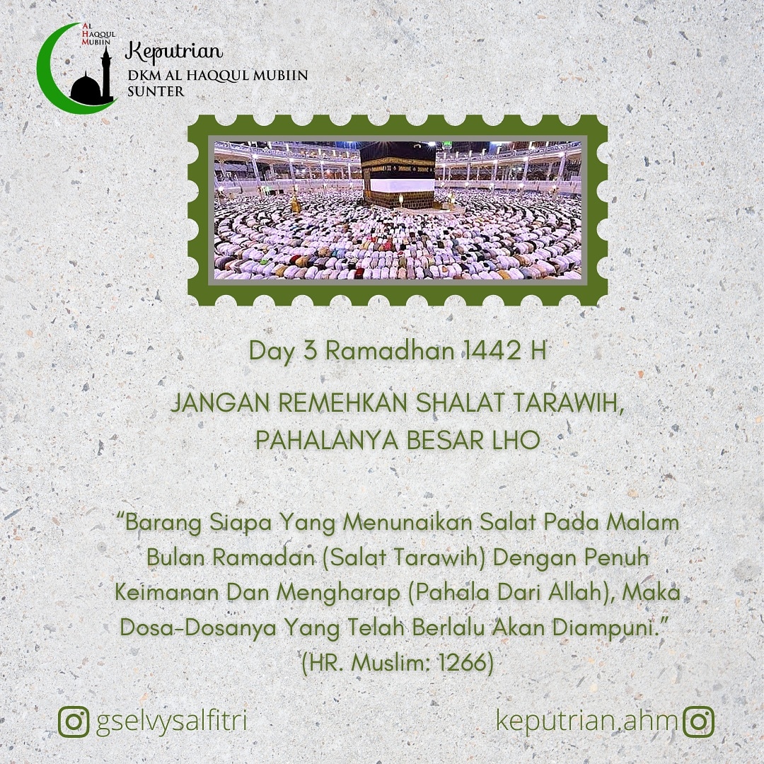“Barang siapa yang menunaikan salat pada malam bulan Ramadan (salat Tarawih) dengan penuh keimanan dan mengharap (pahala dari Allah), maka dosa-dosanya yang telah berlalu akan diampuni.” (HR. Muslim: 1266) -