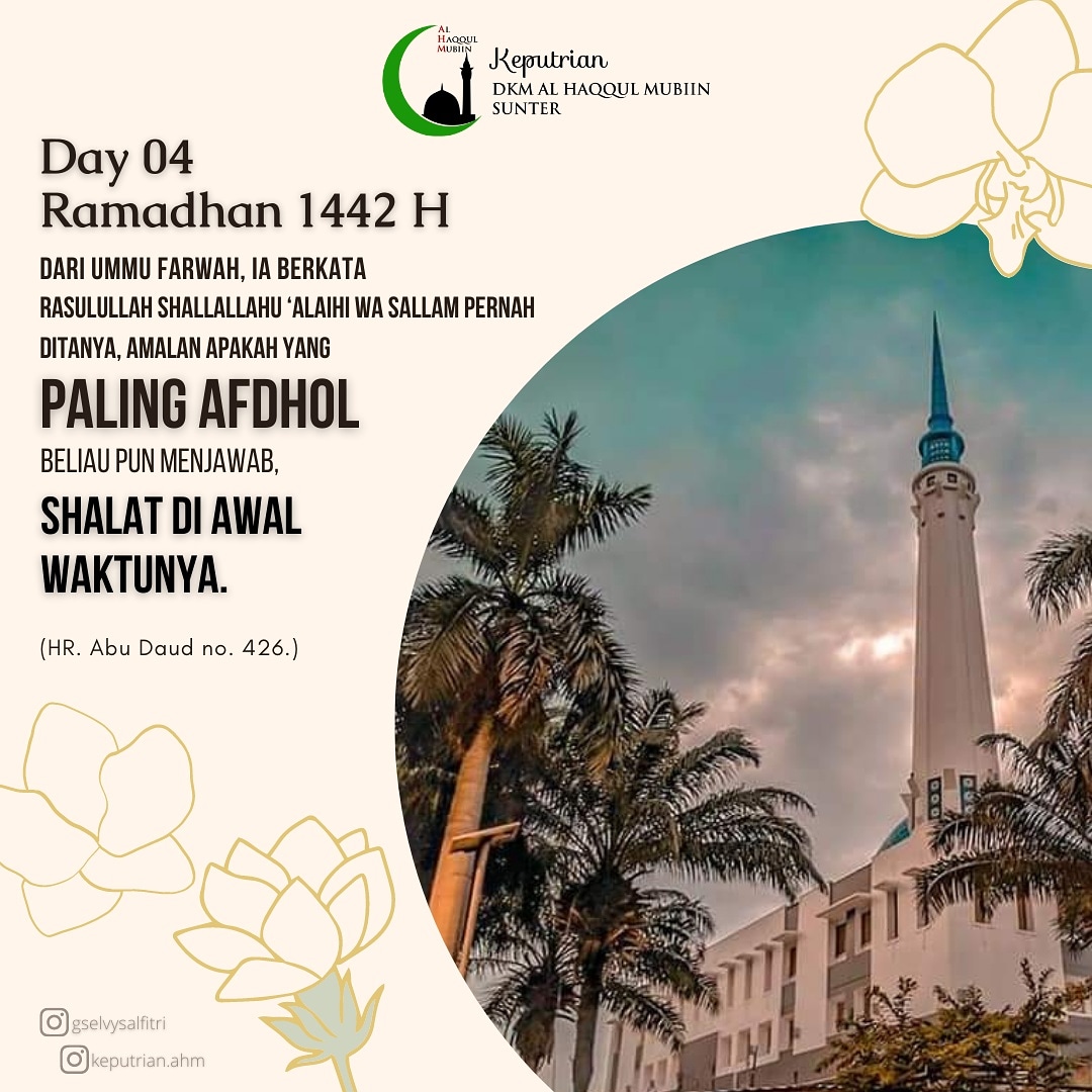 4 tahun yang lalu PublikDari Ummu Farwah, ia berkata, “Rasulullah shallallahu ‘alaihi wa sallam pernah ditanya, amalan apakah yang paling afdhol. Beliau pun menjawab, “Shalat di awal waktunya.” (HR. Abu Daud no. 426.)