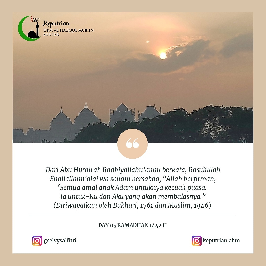 Dari Abu Hurairah Radhiyallahu’anhu berkata, Rasulullah Shallallahu’alai wa sallam bersabda, “Allah berfirman, ‘Semua amal anak Adam untuknya kecuali puasa. Ia untuk-Ku dan Aku yang akan membalasnya.”