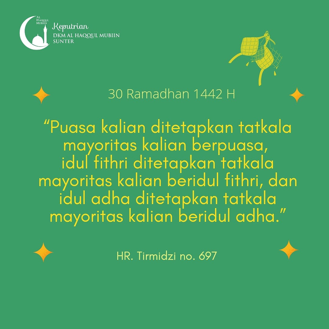 4 tahun yang lalu Publik“Puasa kalian ditetapkan tatkala mayoritas kalian berpuasa, idul fithri ditetapkan tatkala mayoritas kalian beridul fithri, dan idul adha ditetapkan tatkala mayoritas kalian beridul adha.”