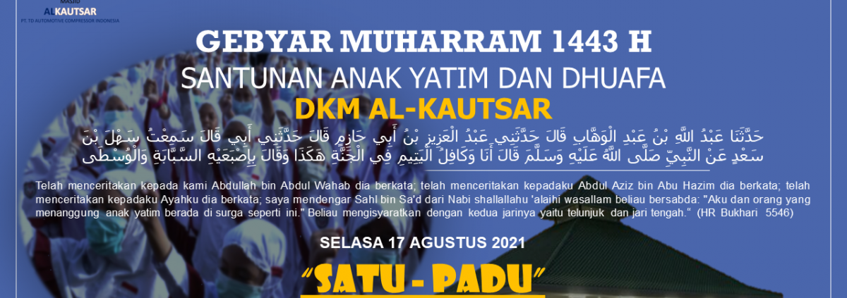 DKM Masjid Al-Kautsar kembali menggelar salah satu agenda tahunan (Gebyar Muharam 1443 H) dengan tema TACI SATU-PADU (Saling Bantu Hingga Pandemi Berlalu), kegiatan ini berupa pembagian paket beserta uang tunai kepada Anak Yatim & Dhuafa sebanyak 200 paket yang akan dilaksanakan pada Hari / Tanggal : Selasa, 8 Muharram 1443 H - 17 Agustus 2021.