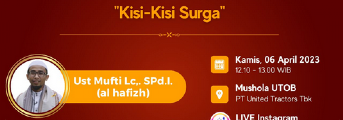 Kajian Ramadhan Series Kamis, 06 April 2023 / 15 Ramadhan 1444 H (Ba'da Sholat Dzuhur berjamaah) Mempersiapkan Masa Depan yang Lebih Baik "Kisi - Kisi Syurga" Ustadz Mufti Syafe'i, Lc. (Al Hafizh) (Mushola UTOB)