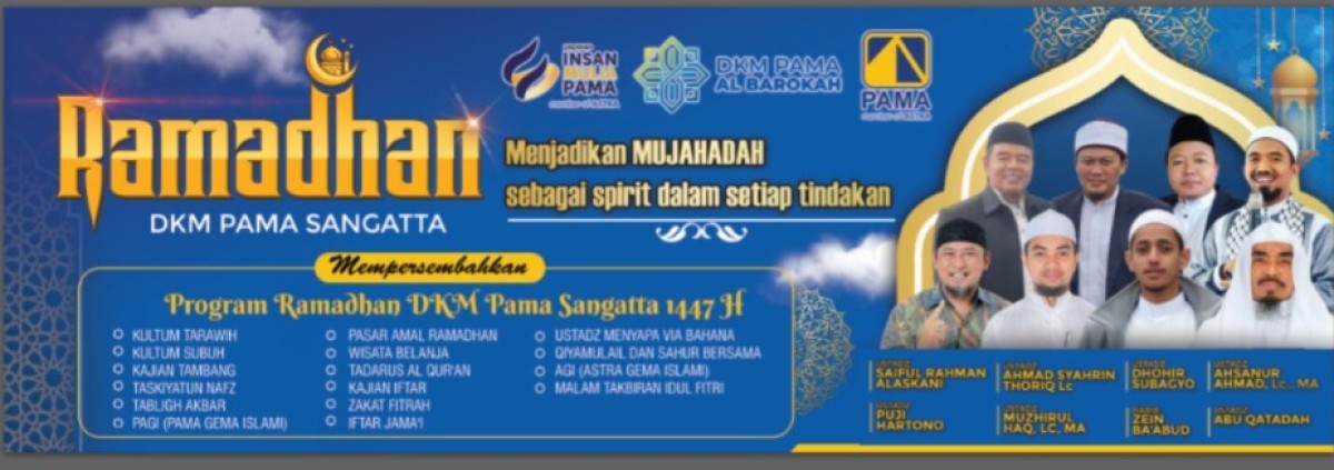 Dalam rangka menyambut bulan suci Ramadhan 1447 H, DKM PAMA Sangatta menghadirkan rangkaian Program Ramadhan yang sarat makna spiritual dan kebersamaan. Mengusung tema “Menjadikan Mujahadah sebagai Spirit dalam Setiap Tindakan”, kegiatan ini menjadi momentum untuk memperkuat keimanan, meningkatkan kualitas ibadah, serta membangun budaya kerja yang dilandasi nilai-nilai Islami.
