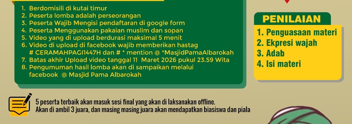 Dalam rangka memeriahkan PAMA Gema Islami 1447 Hijriyah, DKM PAMA Al Barokah kembali menghadirkan ajang inspiratif melalui Lomba Ceramah Kategori Umum untuk tingkat SD, SMP, dan SMA. Kegiatan ini menjadi wadah bagi generasi muda untuk menyalurkan bakat dakwah sekaligus memperkuat pemahaman nilai-nilai keislaman.