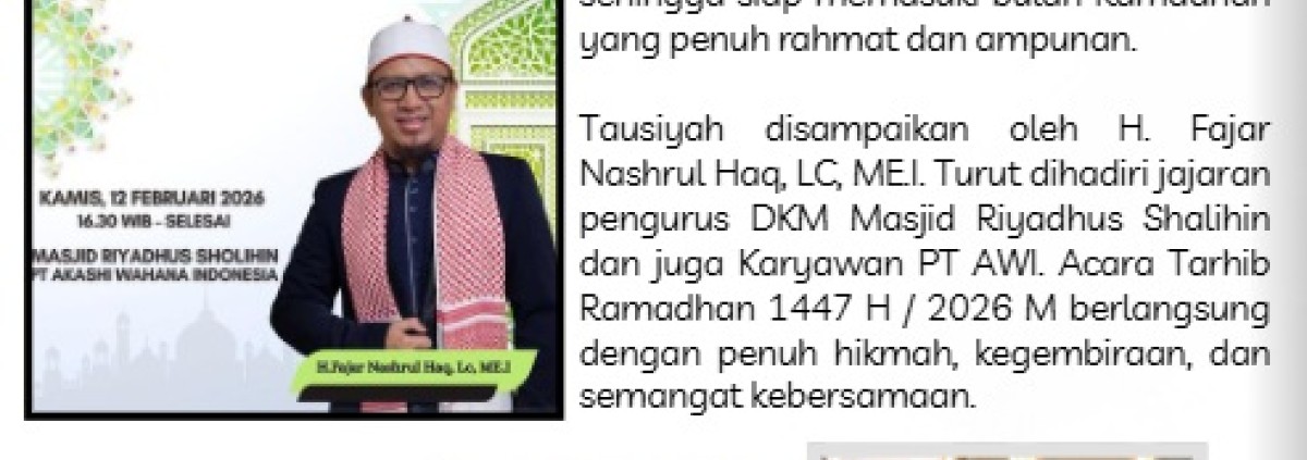 DKM Masjid Riyadhus Sholihin PT Akashi Wahana Indonesia, menyelenggarakan Tarhib Ramadhan 1447H yang menjadi rangkain kegiatan selama bulan Ramadhan ini. Tarhib Ramadhan ini menjadi sarana untuk membersihkan hati dari noda dosa dan memperbaiki diri, sehingga siap memasuki bulan Ramadhan yang penuh berkah dan ampunan.
