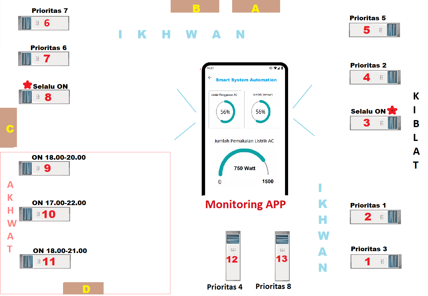 Oleh karena itu, kami menciptakan suatu ide, yaitu "Smart Automation System Upaya Penghematan Energi pada Masjid Astra Melalui Efisiensi Penggunaan AC Berbasis IOT".Sistem ini bukan terfokus pada seberapa banyak pengurangan biaya, melainkan terfokus pada Efisiensi penggunaan AC yang mana akan terjadi pengurangan penggunaan AC yang tidak perlu serta mempengaruhi biaya pemakaian listrik dari AC. Sehingga, Masjid Astra tetap bisa memfasilitasi jamaah dengan area Masjid yang sejuk ketika ada banyaknya Jamaah, namun juga tidak boros AC apabila jumlah jamaah berkurang bahkan menjadi sedikit dengan AC yang otomatis hidup atau mati sesuai jumlah Jamaah yang datang pada area Ikhwan dan otomatis hidup atau mati sesuai waktu yang telah ditentukan pada area Akhwat.