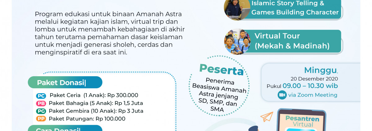 Program edukasi untuk binaan Amanah Astra melalui kegiatan kajian islam, virtual trip dan lomba untuk menambah kebahagiaan di akhir tahun terutama pemahaman dasar keislaman untuk menjadi generasi sholeh, cerdas dan menginspiratif di era saat ini.