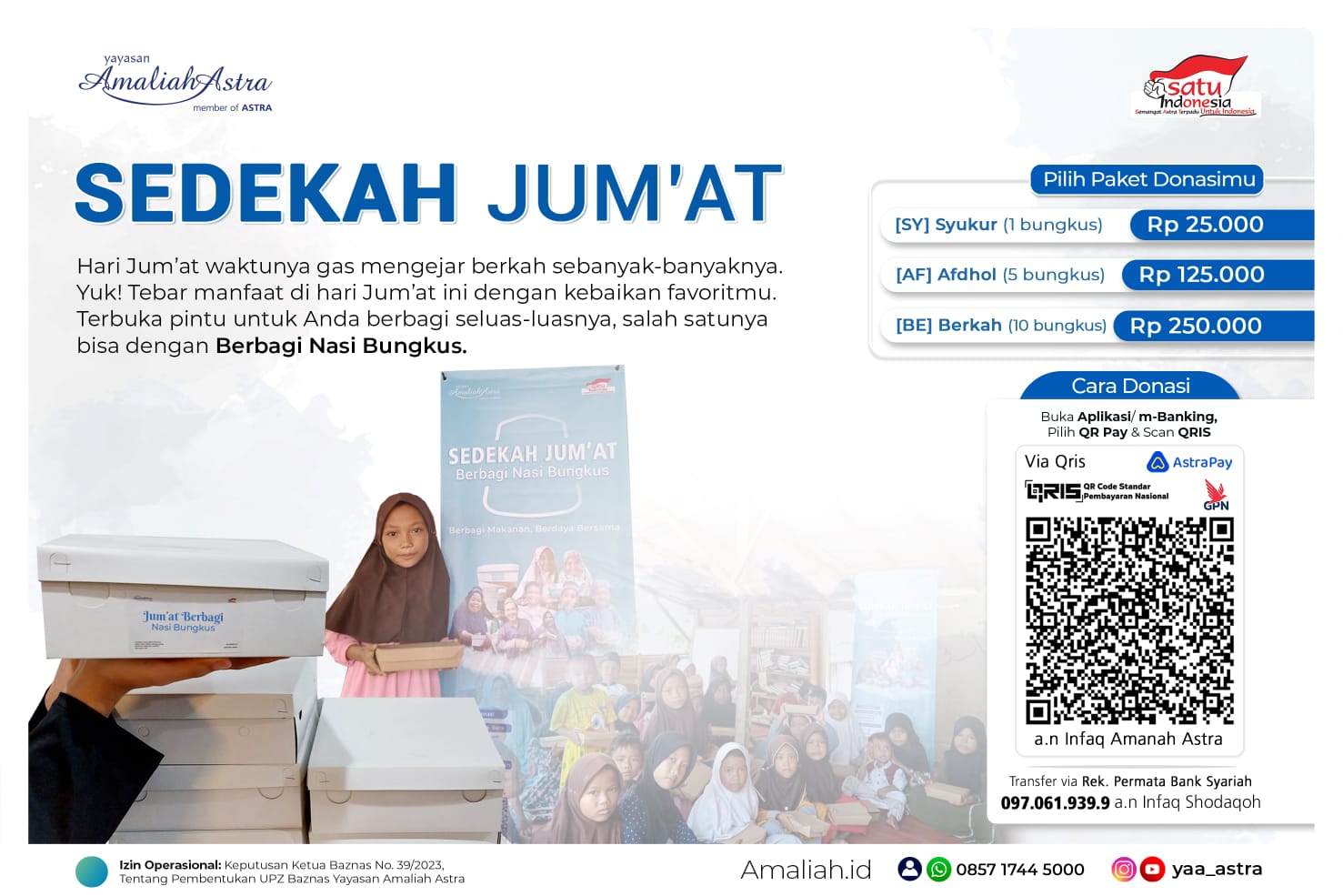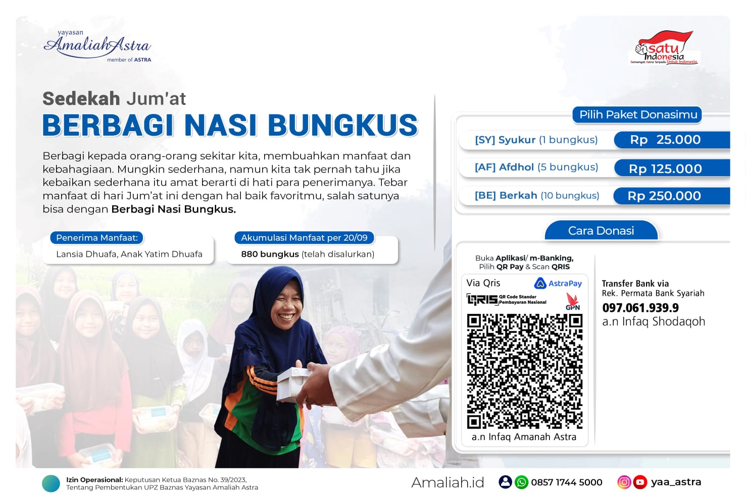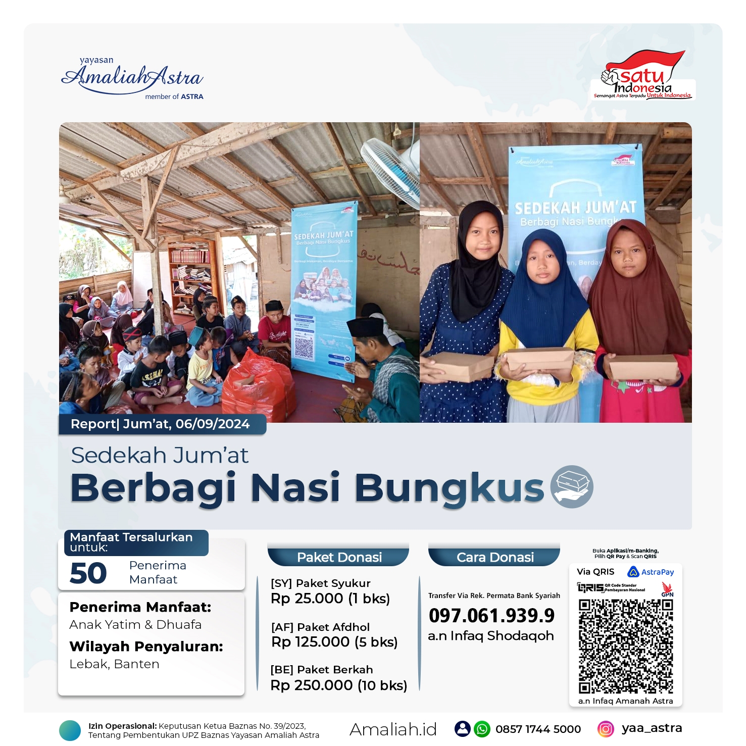 Yuk! tebar manfaat di hari Jum'at ini dengan berbagi nasi bungkus. Mereka akan sangat bahagia saat menerima kebaikan dari Anda.