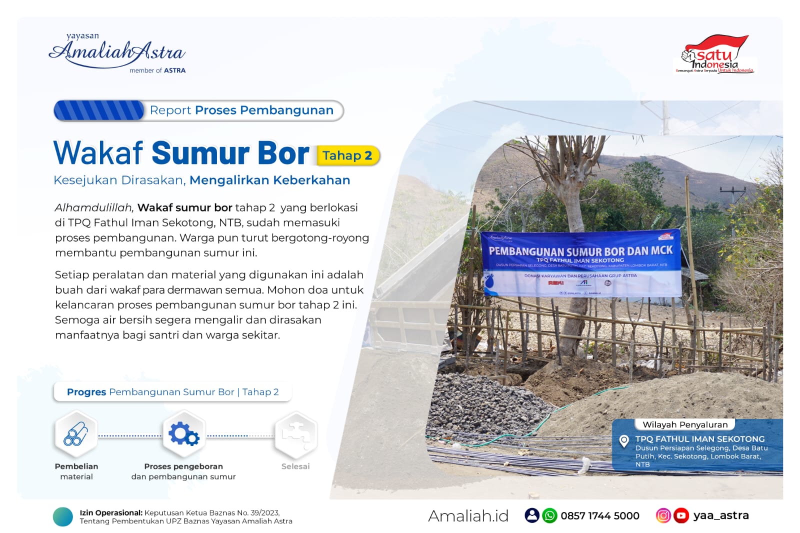 Wakaf Sumur Bor Tahap 2Setelah menyelesaikan wakaf sumur bor tahap 1. Alhamdulilah, pada senin (23/09/2024) kemarin, proses pembangunan wakaf sumur bor tahap 2 mulai dikerjakan. Berlokasi di TPQ Fathul Iman Sekotong, NTB, disambut antusias oleh warga sekitar.