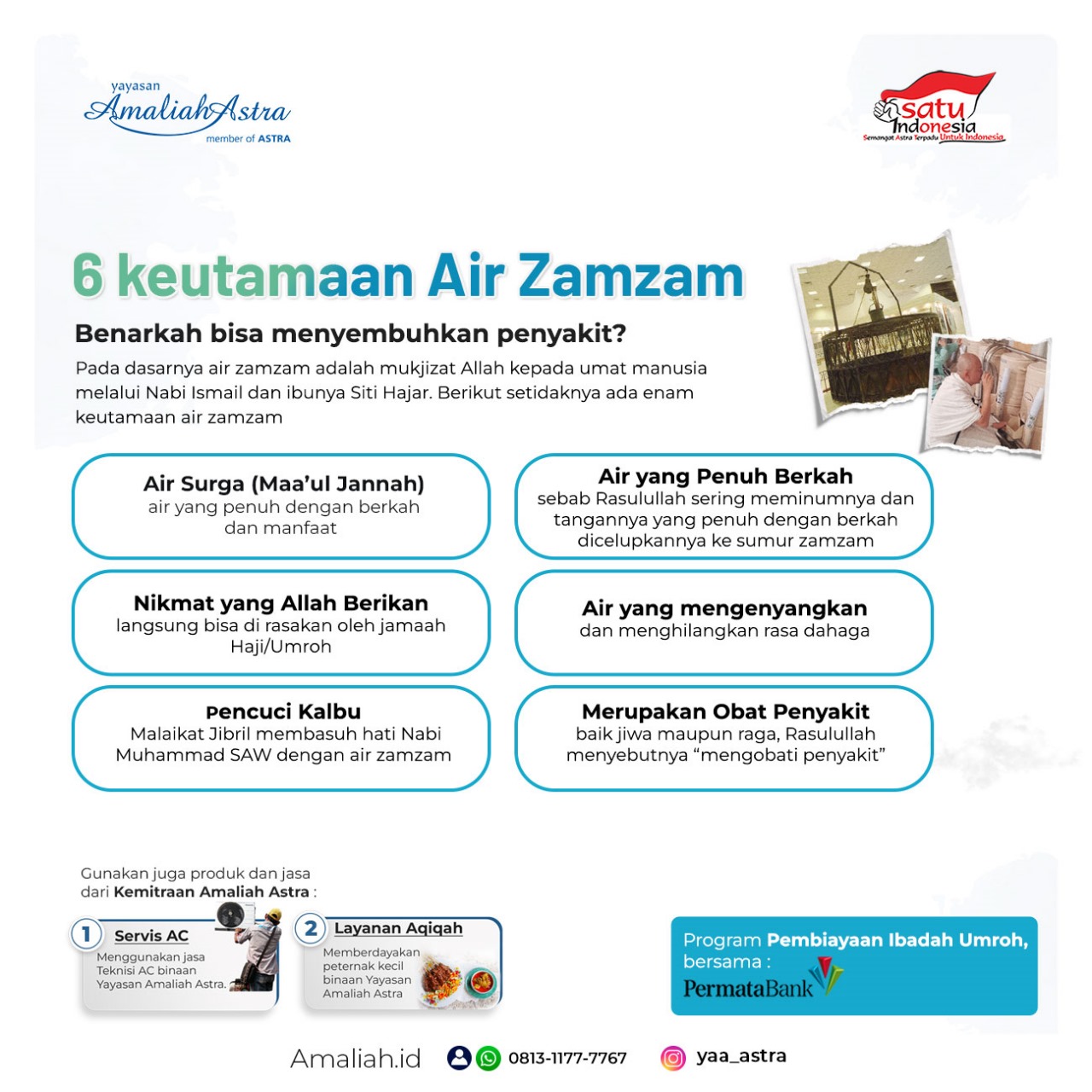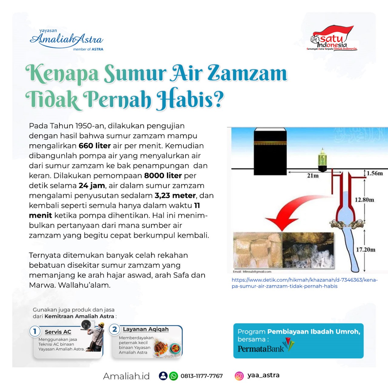 Selain merupakan minuman orang baik, air zamzam merupakan air dari segala niat dari orang yang meminumnya. Secara ilmiah, penyebab air zamzam tidak pernah kering adalah banyaknya rekahan bebatuan disekitar sumur zamzam yang memanjang ke arah hajar aswad, arah Safa dan Marwa. Wallahu’alam.Info Umroh dan Pembiayaan Ibadah di Amaliah Astra :