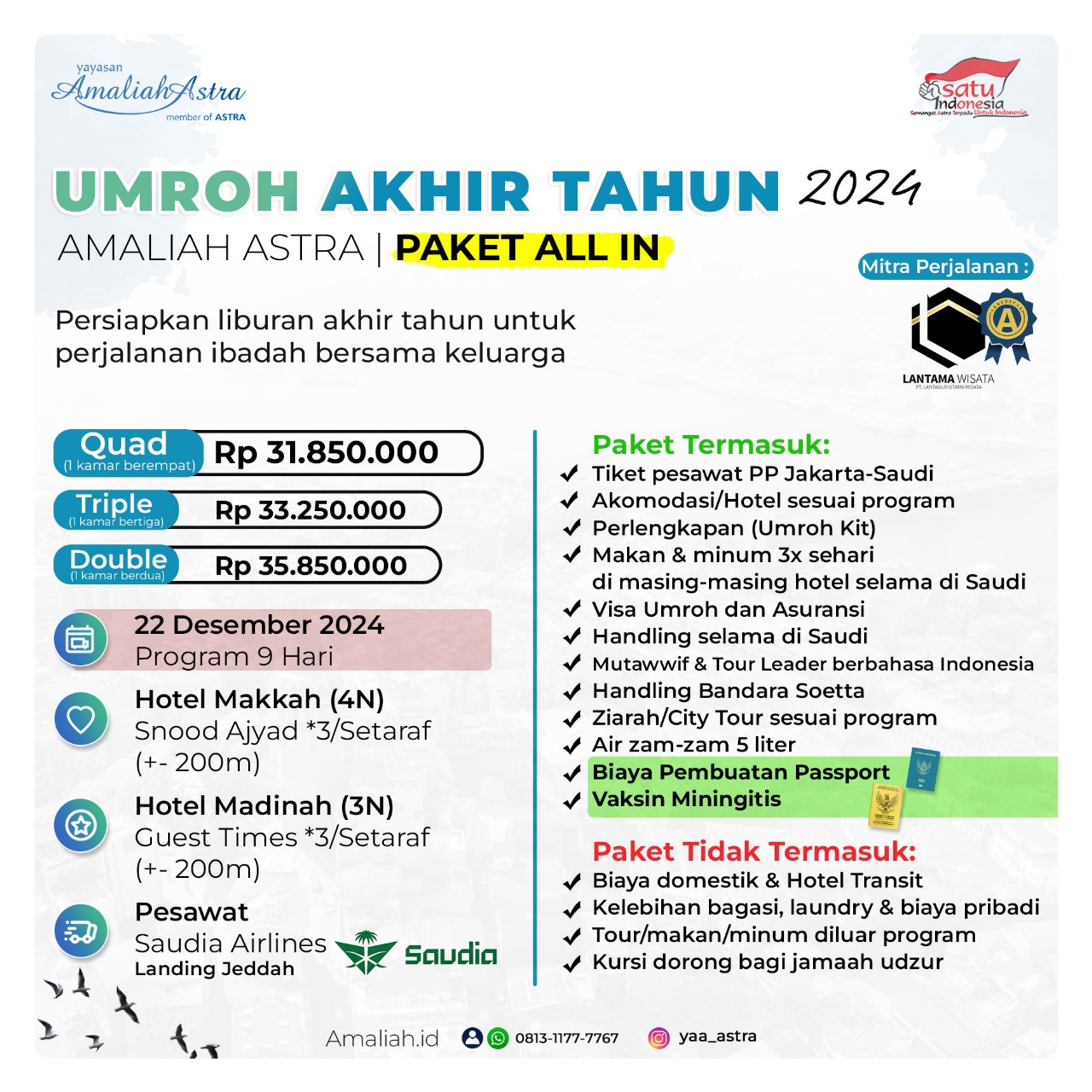 Beberapa bulan lagi kita menuju akhir tahun 2024, waktu yang cukup untuk merencanakan agenda maupun kesiapan financial agar liburan tahun ini terasa lebih khidmat. Bersama Amaliah Astra, Raih Keberkahan di Tanah Suci Bersama Para Penghafal Al Qur'an.Info Umroh dan Pembiayaan Ibadah di Amaliah Astra :