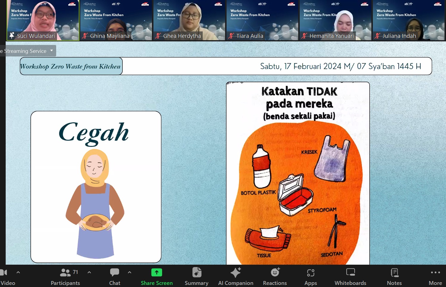 Sedang berlangsung WorkShop Zero Waste From Kitchen oleh tim Akhwat AGI 14. Dalam rangka bulan Peduli Sampah di bulan Februari ini, tim Akhwat berkolaborasi memberikan ilmu bagi para kaum perempuan untuk lebih bijaksana dalam kehidupan sehari-hari khususnya wilayah dapur.