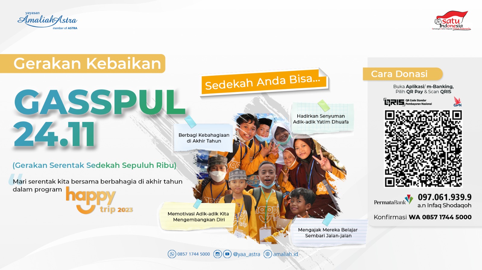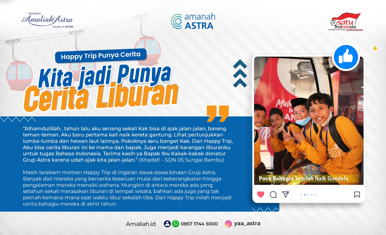 “Alhamdulillah.. tahun lalu aku senang sekali Kak bisa di ajak jalan-jalan, bareng teman-teman. Aku baru pertama kali naik kereta gantung. Lihat pertunjukkan lumba-lumba dan hewan laut lainnya. Pokoknya seru banget Kak. Dari Happy Trip, Aku bisa cerita liburan ini ke mama dan bapak. Juga menjadi karangan liburanku untuk tugas Bahasa Indonesia. Terima kasih ya Bapak Ibu Kakak-kakak donatur Grup Astra karena udah ajak kita jalan-jalan.” (Khadafi - SDN 05 Sungai Bambu)