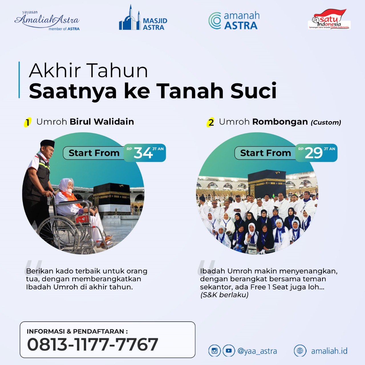 Akhir Tahun pasti akan menjadi momen berlibur untuk kita semua, tidak terkecuali untuk Karyawan di Grup Astra. Rutinitas pekerjaan membuat kita bisa merasa kelelahan baik mental ataupun batin. Yuk, recharge kembali ruhiyah kita di akhir Tahun dengan melakukan perjalanan Ibadah ke Tanah Suci di akhir Tahun. Pilihan paket Umrohnya :